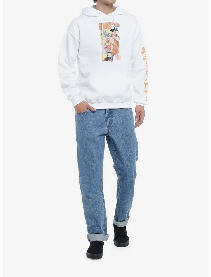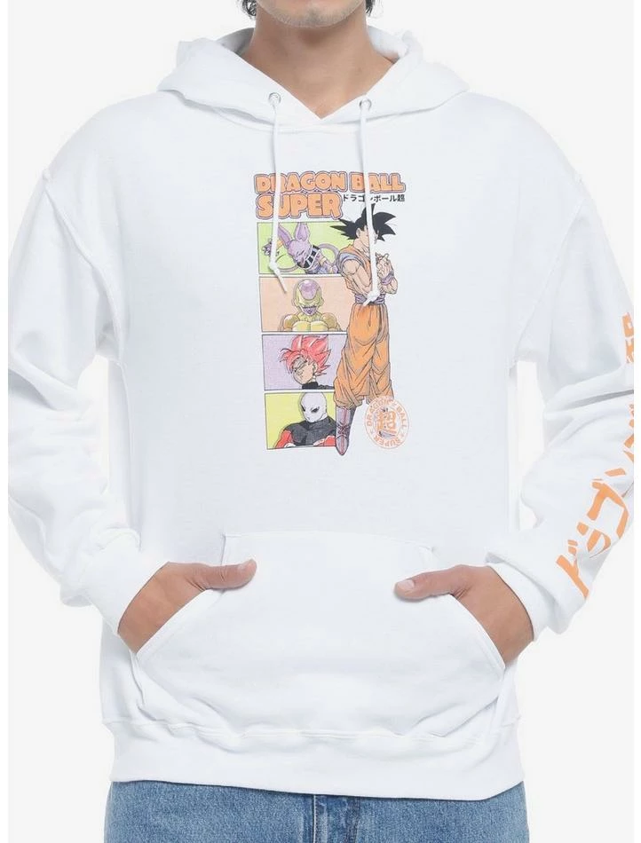 Rep your favorite anime in the colder months with this white hoodie from Dragon Ball Super featuring a Goku with characters design.