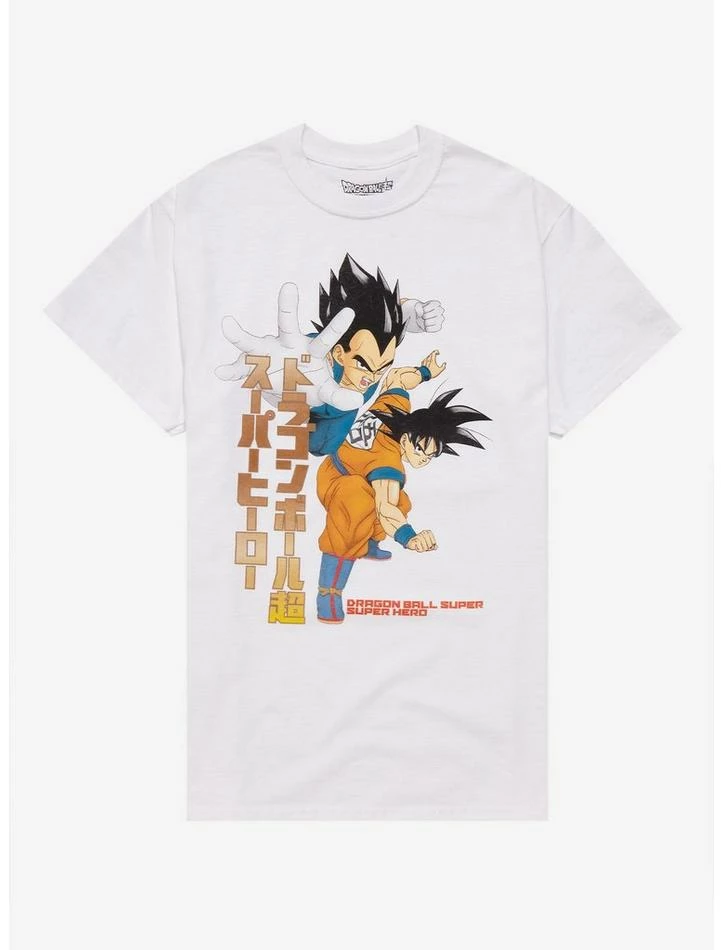 Spar and get in shape for your next battle with your favorite Saiyan duo! From Dragon Ball Super: Super Hero Movie, this tee depicts Goku and Vegeta posing in fighting stances, plus the film’s title in English and Japanese.