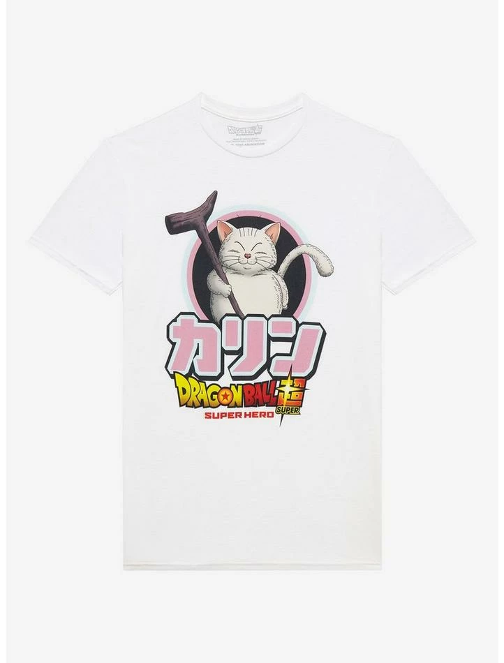 Korin, the almost-1,000 year old cat, is sometimes known as the “God of Martial Arts”, has some Senzu Beans to give you! To get them, you must wear this tee. It features a large portrait of the Dragon Ball cat and the Dragon Ball Super: Super Hero film logo.