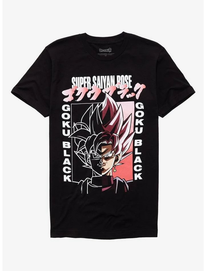Add more Saiyans to your DBS collection with this black tee of Super Saiyan Rose Goku Black. Printed with a split image of his face in the center with his name above and to the sides.